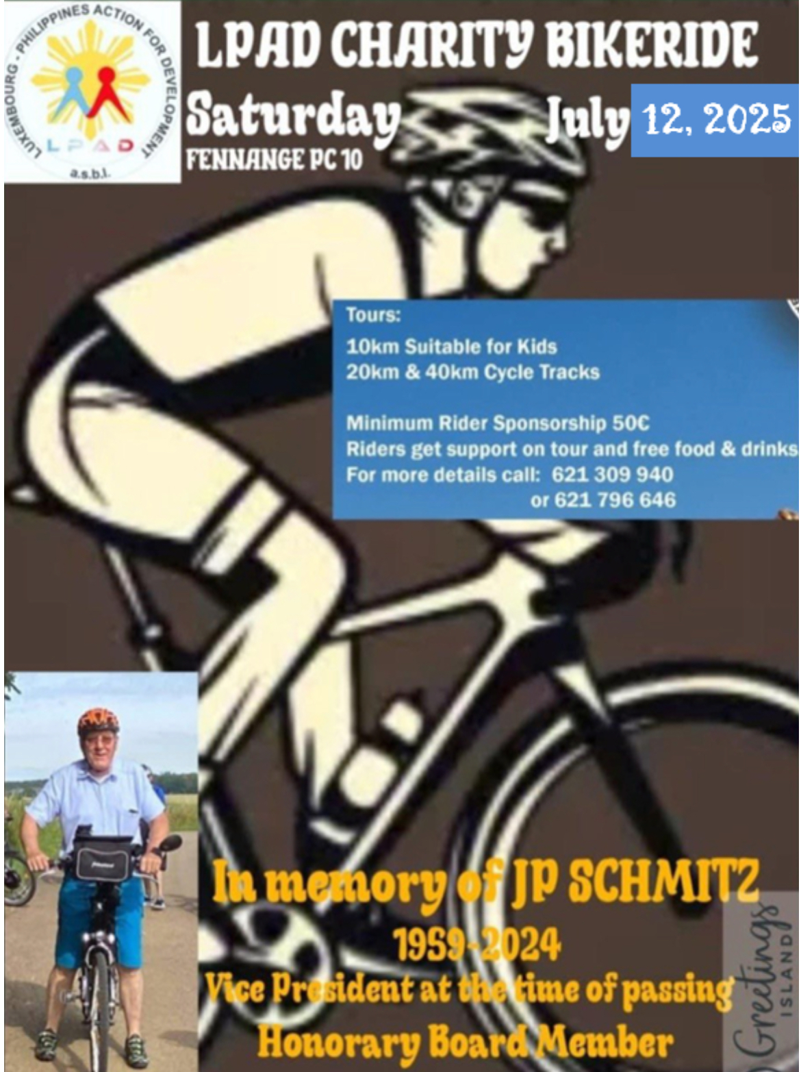 LPAD Charity Bike-Ride July 12th, 2025 June 9, 2025 Start time 2025-07-12 09:00 Finished Time 2025-07-12 17:00 Address Fennange/Bettembourg Content